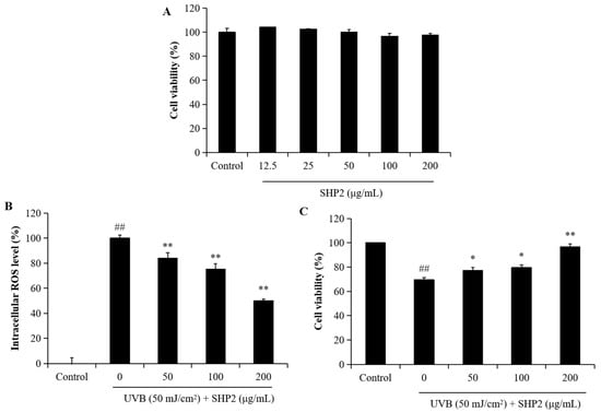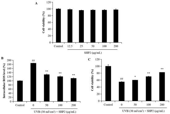 To investigate the anti-UVB-stimulated skin damage effects on HaCaT cells, the cells were exposed to SHP2 at concentrations of 50, 100, and 200 µg/mL and irradiated (30 mJ·cm−2) with UVB. After 24 h of incubation, cell viability, intracellular ROS levels, and apoptotic body formation were assessed using the MTT assay, DCFH-DA assay, and Hoechst 33342 staining, respectively [3].
