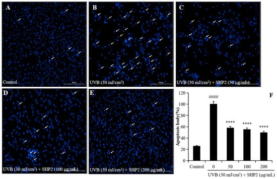 SHP2 protects HaCaT cells against UVB-induced apoptosis. (A) Morphology of the normal cells; (B) morphology of the cells irradiated by UVB; (C) morphology of the cells treated with 50 μg/mL SHP2 and irradiated by UVB; (D) morphology of the cells treated with 100 μg/mL SHP2 and irradiated by UVB; (E) morphology of the cells treated with 200 μg/mL SHP2 and irradiated by UVB; (F) quantification of apoptotic cells. The apoptotic body formation was evaluated by Hoechst 33342 staining assay. White arrows indicate apoptotic bodies. **** p < 0.0001 as compared to the UVB-irradiated group and #### p < 0.0001 as compared to the control group.