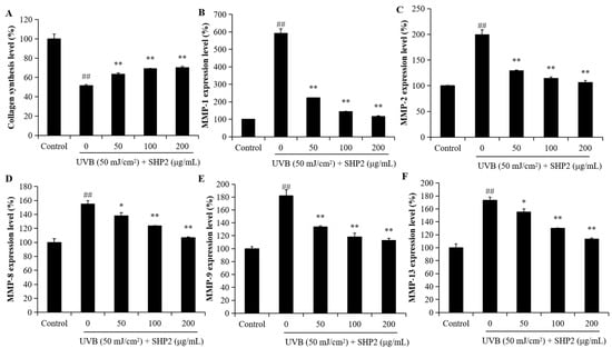 As shown in Figure 4A, collagen levels decreased following UVB irradiation. However, co-treatment with SHP2 at concentrations ranging from 50 to 200 µg/mL significantly restored the collagen synthesis level. This result indicated that treatment with SHP2 enhanced collagen production, contributing to its anti-wrinkle effect. Additionally, Figure 4B–F shows the high MMP levels in UVB-irradiated HDF. However, SHP2 significantly reduced the expression levels of MMP-1,2,8,9, and 13. In particular, the reduction in MMP-8 and MMP-13 stimulated by UVB exposure was restrained in a concentration-dependent manner when HDF cells were incubated with SHP2. SHP2-treated groups exhibited a downward trend in MMPs’ expression, indicating a reduction in MMPs’ activity, which may be beneficial for maintaining ECM integrity. These results demonstrate that SHP2 can inhibit the generation of MMPs in the HDF cells induced by UVB radiation and stimulate the synthesis of collagen proteins, providing evidence for SHP2 as a potential cosmetic ingredient.