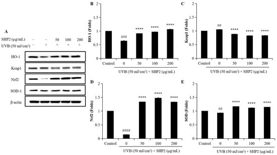 Protective effects of SHP2 on Keap1/Nrf2/HO-1 signaling pathway in UVB-irradiated HDF cells. (A) Western blot bands; (B) HO-1 protein expression; (C) Keap1 protein expression; (D) Nrf2 protein expression; (E) SOD protein expression. The experiments were conducted in triplicate and the data are expressed as the mean ± SE. **** p < 0.0001 as compared to the UVB-irradiated group and ## p < 0.01, ### p < 0.001, #### p < 0.0001 as compared to the control group.