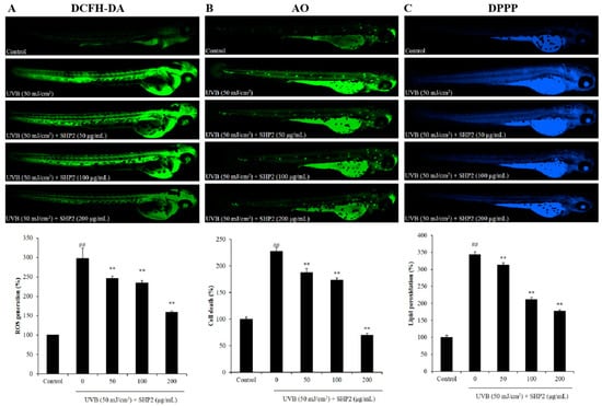 Adult zebrafish were maintained according to the protocols outlined in our previous study [3]. The protective effect of SHP2 against UVB was investigated using 2-day post-fertilization (2dpf) larvae by treating with SHP2 (50, 100, and 200 µg/mL). After a treatment duration of 1 h, the larvae were exposed to UVB radiation at a dose of 50 mJ·cm−2 and incubated for 6 h. ROS generation, cell death, and lipid peroxidation were assessed using DCFH-DA, acridine orange, and DPPP, respectively [34].