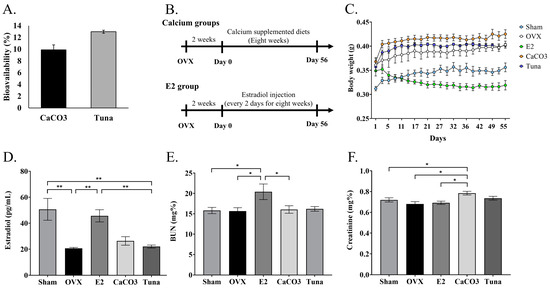 Bioavailability and experimental setup in ovariectomized rats. (A) The percentage of calcium absorption measured in Caco-2 monolayer cells comparing tuna bio-calcium and calcium carbonate (CaCO3). (B) A schematic of the experimental design for calcium supplementation in ovariectomized rats. (C) Body weight changes over the 8-week supplementation period across different groups. (D) The levels of estradiol in each group measured at the end of the experimental period. (E) Blood urea nitrogen (BUN) levels. (F) Creatinine levels in all experimental groups. Data are presented as mean ± SEM (n = 5). * indicates p < 0.05 and ** indicates p < 0.01.