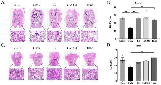 Bone microarchitecture was analyzed by microCT imaging to obtain the volume data of bones in the femur and tibia of ovariectomized (OVX) rats. The reconstructed 3D structures of the bones were demonstrated (Figure 2A,C) and the differences in the percentage of bone volume to total volume (BV/TV) between each group were found (Figure 2B,D). Among other groups, OVX rats exhibited the lowest BV/TV values in both femur and tibia (p < 0.05) with approximately 39% and 43%, respectively, indicating significant bone loss due to estrogen deficiency from ovariectomy. Interestingly, the sham provided the highest BV/TV values (p < 0.05) (around 52% and 55% for femur and tibia, respectively), compared to other treated groups, reflecting normal bone structure. Notably, the CaCO3 and tuna groups demonstrated improvements in BV/TV, comparable to the E2 group. These results collectively suggested that both calcium carbonate and tuna bio-calcium supplementation may play significant roles in preserving or enhancing bone density in OVX rats.