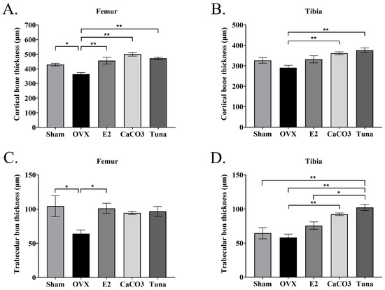 In addition, trabecular thickness (Tb.Th.) and cortical thickness (Co.Th.) were also evaluated by histomorphometry analysis. For cortical bone thickness, the OVX control group showed the lowest values (p < 0.05) (around 363 and 290 µm in femur and tibia, respectively), while the sham, E2, CaCO3, and tuna bio-calcium groups exhibited significantly higher cortical bone thickness in both the femur and tibia (p < 0.05) (Figure 4A,B). Interestingly, both calcium supplemented groups (CaCO3 and tuna bio-calcium) demonstrated the highest values of Co.Th (p < 0.05). For trabecular bone thickness, the OVX group also had the lowest trabecular thickness in both the femur and tibia (p < 0.05). The other calcium, including sham, E2, CaCO3, and tuna bio-calcium showed significantly thicker trabecular bone, with the tuna bio-calcium group having the highest values (p < 0.05) (Figure 4C,D).
