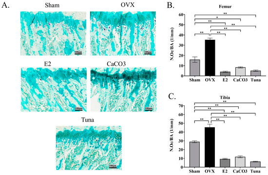 To evaluate bone microarchitecture and density, a quantitative histological analysis was conducted. This analysis provided data on BA/TA (bone area/total area), Tb.Th. (trabecular thickness), and Co.Th. (cortical thickness) for the femur and tibia across various treatment groups. The representative images of bone histomorphometry were illustrated in Figure 3A,C. Overall, calcium-treated groups (CaCO3 and tuna bio-calcium), the hormone-treated group (E2), and the sham group demonstrated a significantly higher percentage of BA/TA in the femur, ranging from 23 to 26%, compared to the OVX group, which showed around 13% (Figure 3B). No significant difference in the BA/TA value was found in the femur between the sham, E2, CaCO3, and tuna groups (p > 0.05). The same trend was also observed in the tibia, in which the OVX group demonstrated the lowest BA/TA (around 17%) (p < 0.05) compared to other groups (24–29%). However, the BA/TA value of the tibia was slightly higher in tuna group (p < 0.05), compared to CaCO3, E2, and sham (Figure 3D).