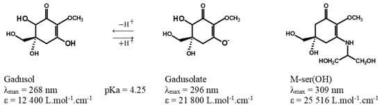 Gadusol (Gd, C8H12N2O6, Ɛ269nm (molar absorptivity) = 12,400 [] or Ɛ264nm = 12,900 [] L.mol−1.cm−1, gadusolate Ɛ296nm = 22,200 or 21,800 [] or 22,750 [] L.mol−1.cm−1, Figure 1) produced by yeasts was kindly offered by Prof. Taifo Mahmud from Oregon State University, USA. The sample was received in 2019 as a lyophilized pure extract and stored at −20 °C until use. Mycosporine-serinol (M-ser(OH), C11H19NO6, Ɛ309nm = 25,516 [] or Ɛ310nm = 27,270 [] L.mol−1.cm−1, Figure 1) extracted from the marine lichen Lichina pygmaea in the Andalusian coast in 2020 was purchased from the Laboratory of Photobiology of the Central Research Services of the University of Málaga (Malaga, Spain). M-ser(OH) was received as lyophilized pure extract and stored at −20 °C until use. The extraction, purification and characterization of the M-ser(OH) were performed as described previously [].