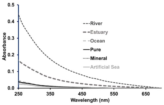 The pH, which affects most chemical and biological processes in the water and the form (acid or basic) of M-ser(OH) and gadusolate, was measured for all matrices. It was equal to 5.3 in pure water, 7.2 in mineral water and slightly basic for the ocean, river and estuary water, with a pH of 8.1, 8.4 and 8.5, respectively. The pH of artificial seawater was fixed at 8.2. These values are in agreement with those reported on water from various sources by Kulthanan et al. []. Natural waters contain a number of weak acids and bases that control the pH, and the most abundant of these species are carbonate and bicarbonate ions []. Changing the proportion of these species in equilibrium induces a pH variation []. A higher concentration of carbonate increases the pH, as is probably the case in estuarine waters, and a lower concentration leads to a decrease in pH, as is observed for seawater. The absorption spectra of the different waters were measured from 250 to 700 nm at room temperature; they are presented in Figure 2. As expected, pure and mineral waters and artificial seawater do not have significant absorbance. However, an absorption was observed for river and estuary waters with a spectrum similar to that recorded in pure water for humic substances [] present in natural matrices. The low absorption measured for ocean water has already been reported with absorbance values very close to those of surface waters in the tropical Atlantic Ocean []. According to the literature [], the absorbance intensity is correlated with the concentration of colored dissolved organic matter (CDOM), chemically complex organic compounds which can absorb UV-A, UV-B and visible light. Estuary water, resulting from the transfer of water from the river to seawater, has an absorption value (A250nm = 0.18) between that of the river (A250nm = 0.45) and that of the ocean (A250nm = 0.05) leading to a dilution factor of around 3 for CDOM relative to the CDOM in the river.