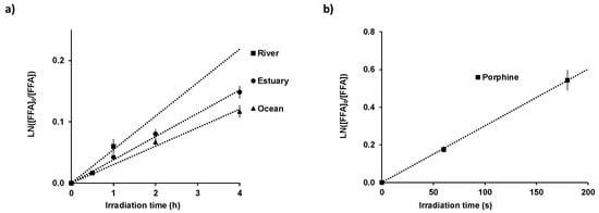 Variation of Ln([FFA]0/[FFA]) as a function of solar irradiation time for the natural matrices, namely, river, estuary and ocean (a); and for porphine in pure water at room temperature, [FFA]0 = 3.1 × 10−5 mol.L−1 (b). The values are presented as mean ± standard deviation, n = 3.