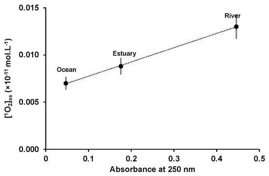 The calculated steady state singlet oxygen concentrations are in accordance with the measured values on the surface of various freshwater and coastal waters (10−11 and 10−14 mol.L−1) []. [1O2]ss decreased from river ((13 ± 1) × 10−14 mol.L−1) to estuary ((8.8 ± 0.9) × 10−14 mol.L−1) and ocean water ((7.0 ± 0.7) × 10−14 mol.L−1), and may be related to the concentration variation in CDOM. The plot of the natural matrices’ absorbance at 250 nm, as a function of the steady state singlet oxygen concentration, showed a linear dependence (Figure 4), highlighting the correlation between singlet oxygen generation and CDOM.