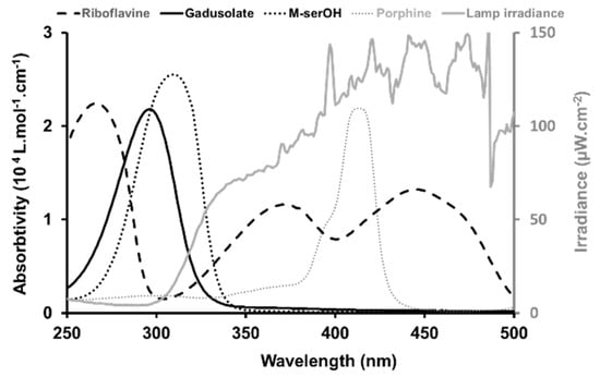 To the best of our knowledge, the photolysis of mycosporine-serinol in the presence of flavin was briefly studied by Bernillon et al. [], but its photostability has never been reported before. In this study, the photostability of gadsusolate and mycosporine-serinol is thoroughly investigated in different natural matrices and in the presence of photosensitizers.