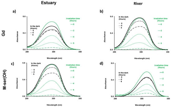 Time-dependent absorption spectra of gadusolate ([Gd]0 = 1.5 × 10−4 mol.L−1 in estuary and 1.7 × 10−4 mol.L−1 in river water) (a,b); and M-ser(OH) ([M-ser(OH)]0 = 1.3 × 10−4 mol.L−1 in estuary and 1.2 × 10−4 mol.L−1 in river water) (c,d), in the dark and under irradiation in estuary and in river water for 6 h, l = 0.2 cm.