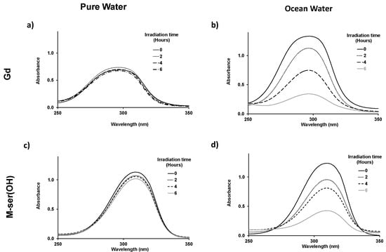 Time-dependent absorption spectra of gadusolate ([Gd]0 = 1.7 × 10−4 mol.L−1 in pure water and 3.1 × 10−4 mol.L−1 in ocean) (a,b) and M-ser(OH) ([M-ser(OH)]0 = 2.2 × 10−4 mol.L−1 in pure water and 2.4 × 10−4 mol.L−1 in ocean) (c,d), in pure water and ocean after 0, 2, 4, 6 h of irradiation; l = 0.2 cm.