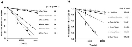 The photodegradation rates for the different water matrices were obtained from the slope of the linear fit of the absorbance data (at 296 nm for gadusolate and 310 nm for M-ser(OH)) as a function of irradiation time (Figure 8).