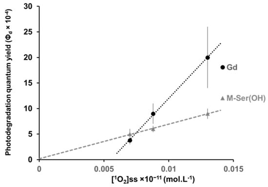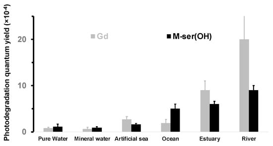 The results show a similar behavior for both M-ser(OH) and gadusolate in all aqueous solutions with a high photostability (Φd < 20 × 10−4) which is, however, influenced by the matrices. Indeed, the quantum photodegradation yield decreases by more than one order of magnitude from river water Φd,Gd = (20 ± 6) × 10−4 and Φd,M-ser(OH) = (9 ± 1) × 10−4 to pure water Φd,Gd = (0.8 ± 0.2) × 10−4 and Φd,M-ser(OH) = (1.1 ± 0.6) × 10−4. The highest values are observed for natural waters and are proportional to the [1O2]ss measured for these matrices (Figure 10). Extrapolation from the regression line in the case of M-ser(OH) for [1O2]ss = 0 gives a value of (0.2 ± 00.4) which is close to that in pure and mineral water. The quantum yield for gadusolate is probably overestimated since a slight decomposition was observed in the dark but the slope difference observed seems to indicate a different reactivity with singlet oxygen between M-ser(OH) and gadusolate.