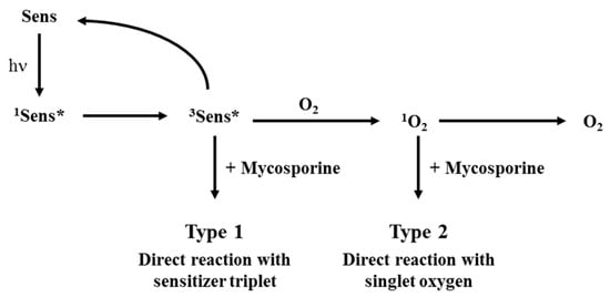 Sensitized photodegradation pathways (Sens (sensitizer ground state), 1Sens* (sensitizer first excited state) are 3Sens* sensitizer triplet state). Note: in the figure, ‘+Mycosporine’ is related to M-ser(OH) or gadusolate.