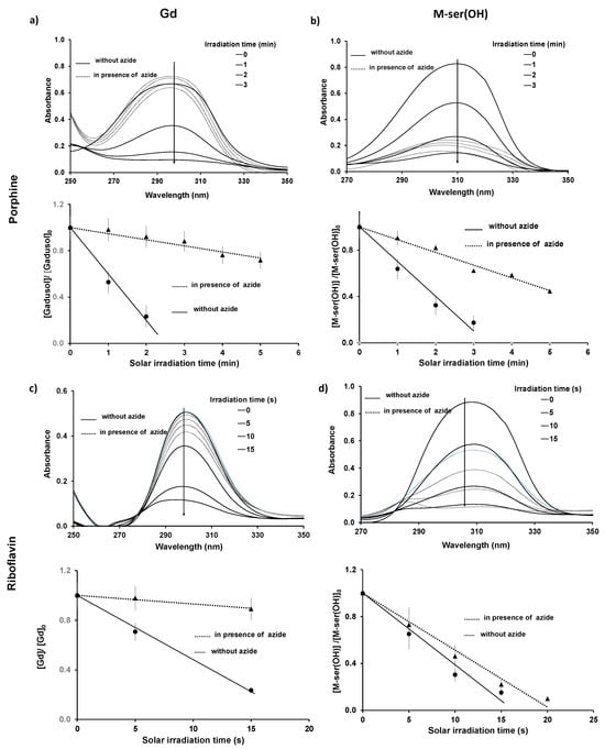Time-dependent absorption spectra of gadusolate (1 × 10−4 mol.L−1 < [Gd]0 < 1.8 × 10−4 mol.L−1) and M-ser(OH) (4.7 × 10−5 mol.L−1 < [M-ser(OH)]0 < 1.7 × 10−4 mol.L−1) after 0, 1, 2 and 3 min of irradiation for porphine (2.0 × 10−4 mol.L−1) (a,b), and after 0, 5, 10, 15 s of irradiation for riboflavin (4.0 × 10−5 mol.L−1) (c,d), l = 0.2 cm. The values are presented as mean ± standard deviation, n = 3.