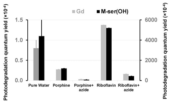 Photodegradation quantum yields of gadusolate and M-ser(OH) in water (left scale) and in the presence of photosensitizers and sodium azide (right scale) under solar irradiation (values are presented as mean ± standard deviation, n = 3).