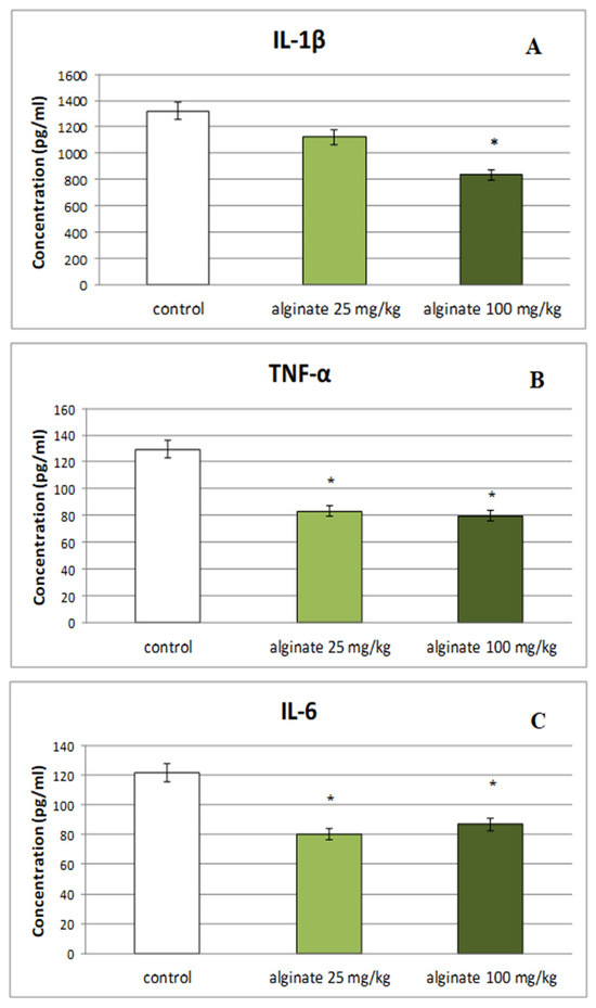 A significant decrease in serum levels of IL-1β was observed only in animals treated with the higher dose of alginate from E. crinita (100 mg/kg bw) in comparison to controls (835.13 ± 70.22 vs. 1318.97 ± 171.14; p < 0.05; Figure 1A). The reducing effect was also observed in TNF-α serum levels of rats treated with alginate isolated from E. crinita at a dose of 25 mg/kg bw (83.31.48 ± 8.37 vs. 129.33 ± 13.81; p < 0.05) and 100 mg/kg bw (79.67 ± 7.36 vs. 129.33 ± 13.81; p < 0.05) when compared with the control group (Figure 1B). As shown in Figure 1C, the levels of IL-6 in the serum of rats treated with both doses of E. crinita alginate were significantly decreased (80.29 ± 7.25 for the lower dose and 86.89 ± 7.82 for the higher dose vs. 121.08 ± 11.16; p < 0.05) in comparison to controls.