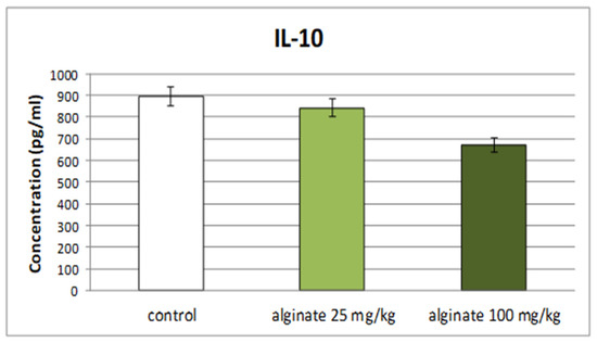 Subchronic treatment of rats with E. crinita alginate at doses of 25 mg/kg and 100 mg/kg bw did not significantly change serum levels of the anti-inflammatory cytokine IL-10 in a model of LPS-induced systemic inflammation in comparison to controls (Figure 2).