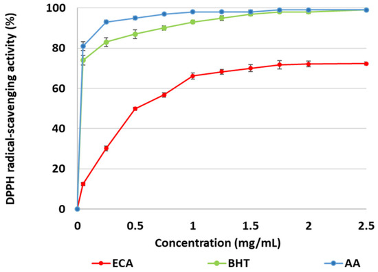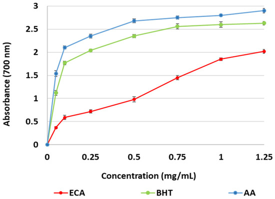 Figure 4 illustrates the capacity of ECA to facilitate the reduction of ferric to ferrous ions in a redox-linked colorimetric reaction. The OD700 of ECA exhibited a considerable range, from 0.37 to 2.02, across a concentration spectrum of 0.05 to 1.25 mg/mL. Hence, the most pronounced rise in activity, almost 50%, was noted between 0.5–0.75 mg/mL, respectively from 0.98 to 1.45. However, BHT and AA demonstrated higher reducing capacity in the tested concentrations (Figure 4).