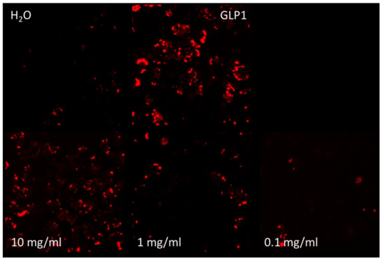 The test compound, SPH, was assessed against positive controls, a standard GLP-1 receptor agonist (Sigma-Aldrich H6795) and a standard GIP receptor agonist (Tocris, Minneapolis, MN, USA, 2257), both at a concentration of 1 µM (ca. 0.004 mg/mL). Negative control was PBS alone and sterilized water added to PBS. SPH was first diluted in sterilized water at 100 mg/mL and filtered with a 0.2 µm filter to avoid contamination. A dose-response assay was performed at three concentrations in 1:10 serial dilutions of SPH, starting with 10 mg/mL, consistent with previous work undertaken to assess the FTH1 and HMOX1 activity of SPH.