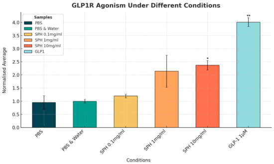 The change in GLP-1 activity with SPH and with a GLP-1 agonist could be seen clearly on fluorescence intensity images (see Figure 1). SPH demonstrated a dose-dependent response in GLP-1 receptor activity, with the lowest concentration of 0.1 mg/mL showing minimal activity. In contrast, the 1 mg/mL and 10 mg/mL doses resulted in a 2-fold and 2.4-fold increase in GLP-1 receptor activation, respectively, compared to the negative control of phosphate-buffered saline (PBS) and PBS with water. The 10 mg/mL dose of SPH resulted in a significant increase in GLP-1 receptor activity (p < 0.05), and the 1 mg/mL showed a near-significant trend (p = 0.052). The GLP-1 receptor agonist (positive control) showed a significant 4-fold increase in GLP-1 receptor activity compared to the negative control (p < 0.01) at a concentration of 1 µM (see Figure 2).