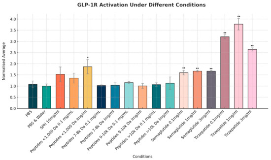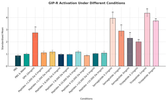 While SPH at 10 mg/mL exhibited marked GIP agonist activity, with a normalized mean increase in GIP receptor activity of 2.8-fold (p < 0.01), none of the individual peptide fractions at 1 mg/mL elicited similar levels of activity, and all changes were non-significant (p > 0.05). This suggests that the observed activity in SPH is mediated by a peptide fraction between >1000 Da and <7000 Da. In comparison, semaglutide showed more than twice the level of GIP receptor activation, with a normalized mean level of 2.89 (a.u.), with 1 mg/mL compared to the maximum level of 1.17 (a.u.) seen with SPH peptides of <1000 Da and of 9000–10,000 Da. The activity of tirzepatide was again the higher with a 4.36-fold increase in GIP receptor activation (see Figure 6).
