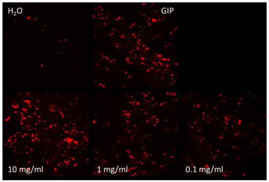 Normalized mean level of GIP receptor activity measured by changes in intracellular cAMP levels. Results are expressed as the fluorescence intensity (arbitrary units/a.u.) of the red cAMP-Nomad biosensor. Each of the six conditions was analyzed in three independent experiments (three replicates per experimental group, n = 3), making a total of eighteen assessments. Data points represent the mean ± standard deviation for each test condition. GIP agonist dose of 1 µM is equivalent to 0.004 mg/mL. * Indicates a p-value of <0.05, and ** indicates a p-value of <0.01 compared to PBS negative control.