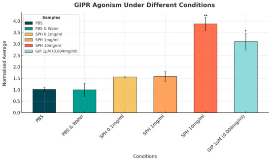 The change in GIP activity with SPH and the GIP receptor agonist could be seen clearly on fluorescence imaging (see Figure 4). SPH demonstrated a dose-dependent response in GIP receptor activity. However, only the highest concentration of 10 mg/mL showed a clear upregulation in activity with a 2.6-fold increase in GIP receptor activation compared to the negative control (p < 0.01). The GIP receptor agonist (positive control), at a concentration of 1 µM, produced a 4-fold increase in GLP-1 receptor activation compared to PBS negative control (see Figure 5).