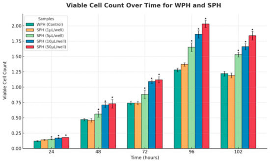 Effect of increasing doses of SPH peptides on the proliferation of pancreatic islet cells (ABC-TC4286 hPIC cells) from 24 h to 102 h, compared to control (WPH/whey protein hydrolysate at 10 µL/well). The concentration of WPH and SPH used is 1 mg/mL. Each of the five conditions was analyzed in three independent experiments at five different time points, making a total of seventy-five assessments. Data points represent the mean ± standard error of the mean for each test article. * Indicates a p-value of <0.01 compared to control (whey protein hydrolysate).