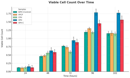 Effect of various marine protein hydrolysates and bovine collagen peptides on the proliferation of pancreatic islet cells (ABC-TC4286 hPIC cells) from 24 h to 102 h compared to control (WPH/whey protein hydrolysate), with all samples dosed at 10 µL/well. VPCPs are commercially available bovine collagen peptides; CPH is cod protein hydrolysate; HPH is herring protein hydrolysate; SPH-C is a salmon protein hydrolysate made with Coralase 7089. All concentrations of test solutions are 1 mg/mL at 10 µL/well. Each of the five conditions was analyzed in three independent experiments at five different time points, making a total of seventy-five assessments. Data points represent the mean ± standard error of the mean for each test article. * Indicates a p-value of <0.01 compared to control.