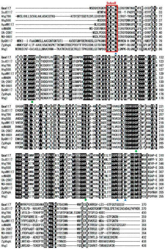 Amino-acid alignment of Gaa117 and other α-NAOSHs. Circles (●) denote catalytic residues and triangles (▲) indicate residues involved in dimer formation. GenBank accession numbers are CAB61805 for ScJC117 from Streptomyces coelicolor A3(2), WP_017446786.1 for Ahg786 from Gayadomonas joobiniege, WP_017446558.1 for Ahg558 from Gayadomonas joobiniege, WP_055733245.1 for AgaWH117 from Agarivorans gilvus, WP_011469134.1 for SdNABH from Saccharophagus degradans, BAQ55620.2 for OA-2007 from Cellvibrio sp., BAV72142.1 for WU-0601 from Cellvibrio sp., WP_007560917 for BpGH117 from Bacteroides plebeius, WP_013995985.1 for ZgAhgA from Zobellia galactanivorans, and WP_077400332.1 for AhgI from Cellulophaga omnivescoria.