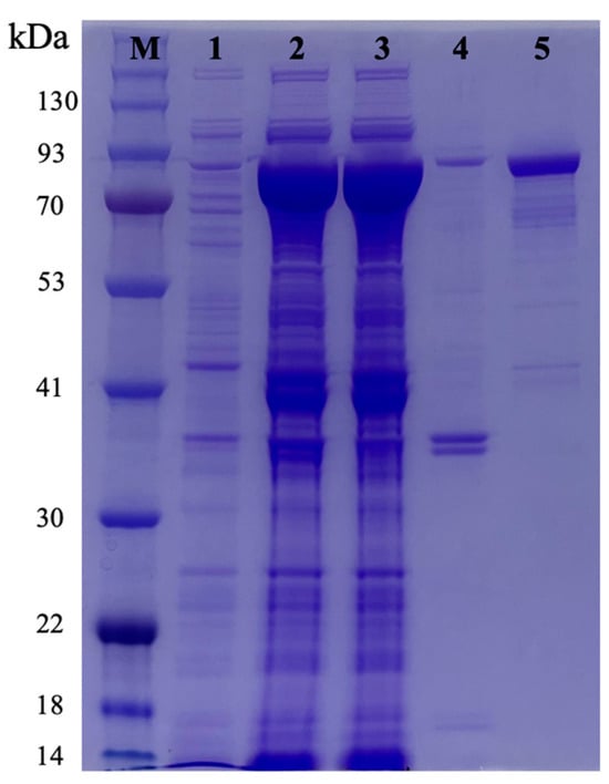 SDS-PAGE analysis of rGaa117. Lanes: M, molecular mass marker; 1, total cell protein before induction; 2, total cell protein after IPTG induction; 3, total cellular soluble extract after induction; 4, total cellular insoluble extract after induction; 5, purified rGaa117.