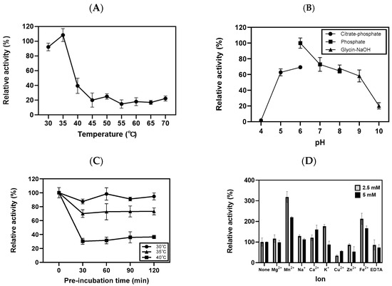 The optimal enzyme activity of rGaa117 was analyzed using the dinitrosalicylic acid method. As shown in Figure 3A, maximum rGaa117 activity was observed at 35 °C, and activity sharply declined above the optimum temperature. Enzyme activity was investigated in a pH range of 4.0–10.0, which revealed that the highest activity was achieved at pH 6.0 in phosphate buffer. More than 60% of the activity was maintained in the pH range of 6.0–8.0 (Figure 3B). Next, the residual activity of rGaa117 after pre-incubation was determined. rGaa117 retained more than 80% and 60% of its initial activity after a 120 min pre-incubation at 30 °C and 35 °C, respectively. However, after pre-incubation at 40 °C for 120 min, the enzyme activity was less than 40% of the initial activity (Figure 3C). We next investigated the effects of various reagents on rGaa117 activity. The activity was inhibited in the presence of CuSO4, ZnSO4, or ethylenediamine tetraacetic acid (EDTA), whereas it was enhanced in the presence of MnCl2, NaCl, CaCl2, or FeSO4. Further, rGaa117 activity was increased in the presence of 2.5 mM KCl, but decreased in the presence of 5 mM KCl. It should be noted that MnCl2 (2.5 mM) enhanced rGaa117 activity by 3.19-fold compared with the control (Figure 3D). The Km, Vmax, and Kcat values of rGaa117 were 22.64 mM, 246.3 U/mg, and 340.7 s−1, respectively.
