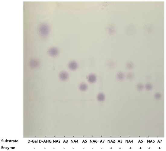 TLC of hydrolysis products by rGaa117 on ENAOSs and OAOSs. d-Gal, d-galactose; d-AHG, 3,6-anhydro-d-galactose; NA2, neoagarobiose; A3, agarotriose; NA4, neoagarotetraose; A5, agaropentaose; NA6, neoagarohexaose; A7, agaroheptaose.