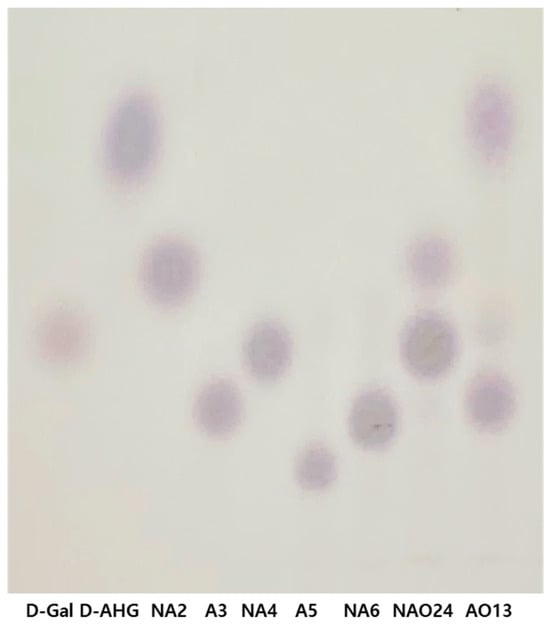 The hydrolyzation products of several rGaa117 substrates were separated on a thin-layer-chromatography (TLC) plate. rGaa117 hydrolyzed neoagarobiose (NA2), neoagarotetraose (NA4), and neoagarohexaose (NA6) into d-Gal, agarotriose (A3), and agaropentaose (A5), which all contain l-AHG. The extent of hydrolysis varied depending on the substrate. NA2 and NA6 were almost completely hydrolyzed, whereas NA4 was less hydrolyzed. Gaa117 did not hydrolyze A3, A5, or agaroheptaose (A7) (Figure 4). These results revealed that Gaa117 is an α-NAOSH that hydrolyzes ENAOSs into l-AHG and OAOSs. The production of mixtures composed of NA2 and NA4 (designated NAO24) by Gaa16B and of l-AHG, A3, and a small amount of d-Gal (designated AO13) by rGaa117 was confirmed using TLC (Figure 5).