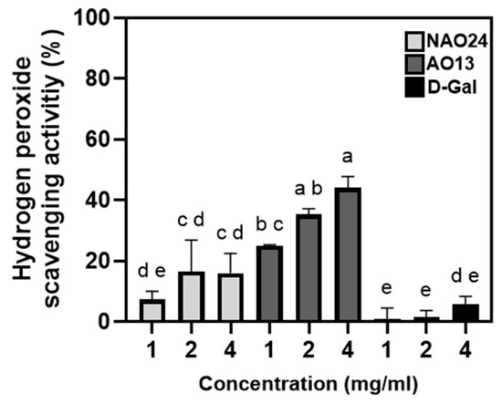 H2O2-scavenging activity of NAO24, AO13, and d-Gal. Different letters indicate significant differences (p < 0.05).