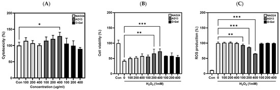 Protective effects of NAO24, AO13, and d-Gal against H2O2-induced oxidative stress in HDFs. (A) Cytotoxicity, (B) cell viability, and (C) ROS production. Values are mean ± SD (n = 3). * p < 0.05, ** p < 0.01, *** p < 0.001 compared with the H2O2-induced group.