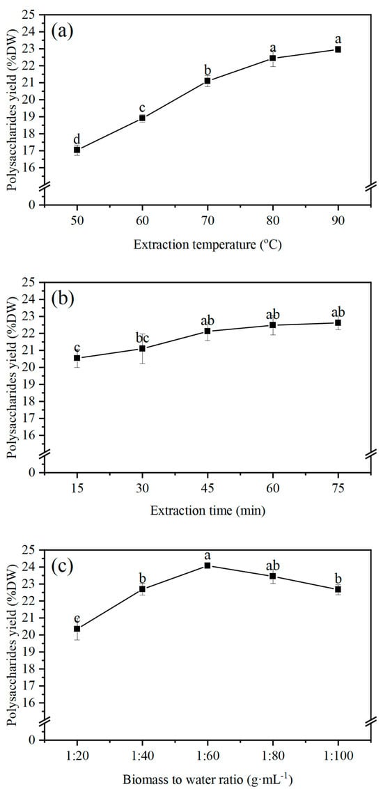 The effects of extraction temperature, extraction time, and biomass-to-water ratio on the yield of polysaccharides: (a) extraction temperature (the extraction time and biomass-to-water ratio were fixed at 60 min and 1:50 g mL−1); (b) extraction time (the extraction temperature and biomass-to-water ratio were fixed at 80 °C and 1:50 g mL−1); (c) biomass-to-water ratio (the extraction temperature and extraction time were fixed at 80 °C and 60 min). Each mean value represents the mean value of three biological replicates and three technical replicates, n = 6. The error bars represent the standard deviations of those means, and different letters indicate significant differences among the treatments at the p = 0.05 level.