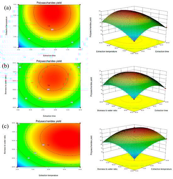 The contour plots and response surface plots of the effects of the extraction temperature, extraction time, and biomass-to-water ratio on the polysaccharide yield: (a) the contour plot and response surface plot of the effects of the extraction time, extraction temperature, and their interaction on the extraction yield; (b) the contour plot and response surface plot of the effects of the extraction time, biomass-to-water ratio, and their interaction on the extraction yield; and (c) the contour plot and response surface plot of the effects of the extraction temperature, biomass-to-water ratio, and their reciprocal interaction on the extraction yield.