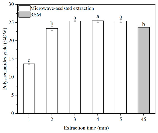 As shown in Figure 3, the extraction yield of polysaccharides showed an increasing trend as the extraction time ranged from 1 to 5 min by using microwave-assisted extraction. The yield of polysaccharides increased from 13.63% DW to 25.41% DW when the extraction time increased from 1 to 3 min. There was no significant difference in the yield of polysaccharides at 3−5 min (p > 0.05). The maximum yield of polysaccharides was 25.48% DW at 5 min. At the same time, the extraction efficiency of polysaccharides reached 96.66%. Moreover, the yield of polysaccharides obtained by microwave-assisted extraction was 7.69% higher than the yield of polysaccharides obtained by RSM extraction (23.66% DW).