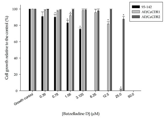 Effect of batzelladine D on the growth of 95-142, AD/CaCDR1 and AD/CaCDR2 cells. Yeast strains were incubated in the presence of two-fold serial dilutions (50–0.39 µM) of batzelladine D at 30 or 37 °C for 48 h. * Significantly lower than the untreated control (p < 0.05).