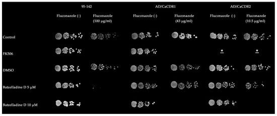 The chemosensitization assays, using the spot method, were performed as described previously []. In brief, cells were suspended to an OD600 of 0.1. Then, 5 µL of five-fold serial dilutions were spotted on an YPD agar (for S. cerevisiae strains) or Sabouraud agar (for the C. albicans isolate) surface in the presence or absence of subinhibitory fluconazole concentrations specific for each strain associated with batzelladine D. Controls were performed using YPD alone, YPD + 0.5% DMSO, YPD + FK506 (a classical inhibitor for CaCDR1, but not for CaCDR2). Plates were incubated at 30 °C (S. cerevisiae) or 37 °C (C. albicans) for 48 h and photographed.