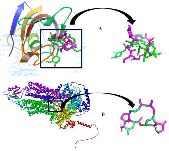 The redocking procedure involved the utilization of crystal structures as illustrated in Figure 9. The ligands, specifically tacrolimus and milbemicyn, were isolated from P43071 and P78595, correspondingly. Subsequently, a meticulous redocking process was executed, returning these ligands to their initial binding sites within their respective protein environments. This intricate task was proficiently achieved using Autodock-vina, a prominent molecular docking tool renowned for its efficacy []. In preparation for this endeavor, Autodock tools facilitated the addition of essential polar hydrogens and flexible rotatable bonds to the ligands. Concomitantly, Kollman charges were thoughtfully incorporated into the protein structures, enhancing their accuracy and relevance. The pivotal task of defining active sites was undertaken using the Discovery study visualizer tool. For the P43071 protein, a spatial region of 26 × 26 × 26 Å was delineated, precisely centered at coordinates −16, 46, and 2 along the X, Y, and Z axes, sequentially. Meanwhile, the P-78595 protein demanded a larger bounding box, measuring 35 × 35 × 35 Å, meticulously positioned at coordinates −11, −4, and −9 along the X, Y, and Z axes, correspondingly. The robustness of this method was verified by means of root mean square deviation (RMSD). A similar protocol was employed for the batzelladine D and further, the mind molecular interactions were revealed by using a Discovery Studio Visualizer.