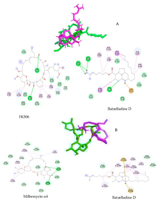Figure 4 shows the molecular interaction diagrams in each case. A and B represent the overlap of batzelladine D with FK506 and milbemycin A4, respectively. It is important to clarify that the overlap with rmsd > 1 Å was expected since both compounds are structurally different; FK506 and milbemycin α4 are both cyclic compounds while batzelladine D is acyclic. However, the latter is able to interact at the active site.