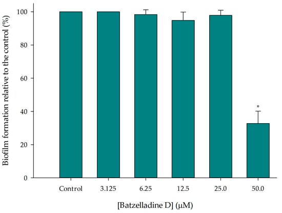 Effect of batzelladine D on C. albicans 95-142 biofilm formation. Yeast strains were incubated in the presence of two-fold serial dilutions (50–3.125 µM) of batzelladine D at 37 °C for 48 h. The values of the untreated control were set to 100%. * Significantly lower than the untreated control (p < 0.05).