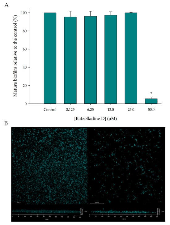 Effect of batzelladine D on C. albicans 95-142 preformed biofilm. (A) Mature biofilms were incubated at 37 °C for 24 h in the presence of two-fold serial dilutions (50–3.125 µM) of batzelladine D. The values of the untreated control were set to 100%. * Significantly lower than the untreated control (p < 0.05). (B) Confocal microscopy images of the mature biofilm control (left) and mature biofilm treated with batzelladine D 50 µM (right).