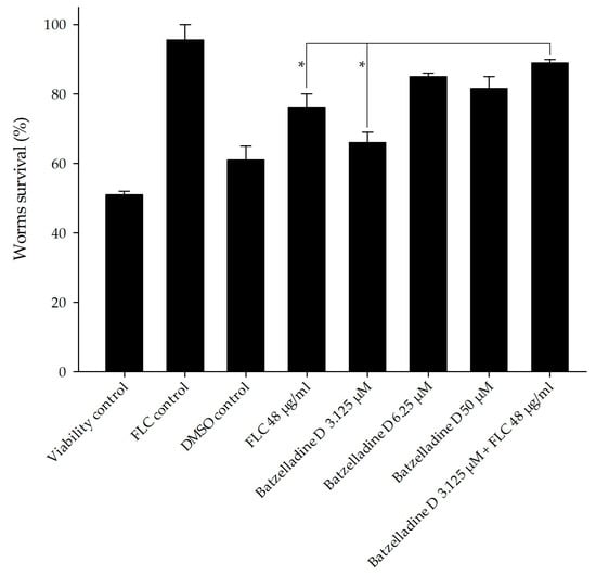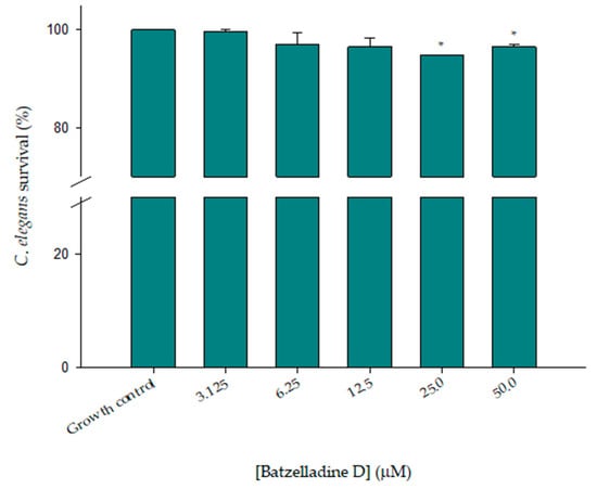Toxicity effect of batzelladine D against C. elegans. Nematodes were incubated in the presence of two-fold serial dilutions (50–3.125 µM) of batzelladine D at 26 °C for 72 h, and later classified as live and dead. The values of the untreated control were set to 100%. * Significantly lower than the untreated control (p < 0.05).