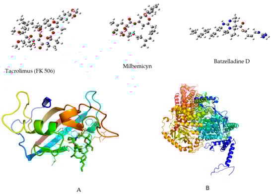 Conversely, ligand structures such as tacrolimus, milbemycin, and batzelladine D were obtained from the PubChem database (https://pubchem.ncbi.nlm.nih.gov/) (accessed on 4 October 2023). These structures were downloaded in .sdf format and subsequently subjected to theoretical optimization using the wB97XD method within the Gaussian 16 software suite for Linux. The energy-minimized structures were validated through frequency calculations, where the absence of negative frequencies ensures the presence of energy minima in each case. These structures were then transformed into .pdb format for utilization in the redocking process. Figure 9 depicts the energy-minimized structures alongside the “clean” proteins with their inhibitors.