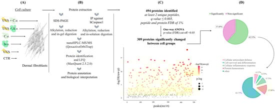 Summary of the experimental design presenting the experimental cell groups [preparation of the CTR, N.o., C.a., UVA, UVA + N.o., and UVA + C.a. cell groups, as explained in Table 1] (A), proteomic sample preparation including SDS-PAGE or IP (immunoprecipitation) and MS/MS proteomic analysis (B), as well as the obtained complete proteomic data with the main statistical thresholds used (C) and a general assessment of the obtained protein groups highlighting their biological functions (cellular antioxidant defense/cell survival and differentiation/cellular inflammatory response/protein homeostasis), and the percentage of identified protein numbers (for each protein group) compared to the number of total identified proteins (D). “Significant” is used for the proteins whose intensities are statistically significantly changed between experimental cell groups according to the one-way ANOVA. “Non-significant” is used for the proteins whose intensities are not changed statistically significantly between cell groups according to the one-way ANOVA. (hCaspase1, human caspase-1; LFQ, label-free quantification; FDR, false discovery rate; nanoHPLC, nano-high-performance liquid chromatography; MS, mass spectrometry; QexactiveOrbiTrap, Q Exactive HF mass spectrometer.)